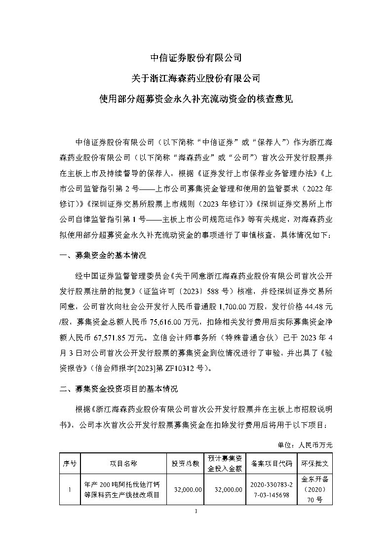 中信證券股份有限公司關(guān)于浙江海森藥業(yè)股份有限公司使用部分超募資金永久補(bǔ)充流動(dòng)資金的核查意見